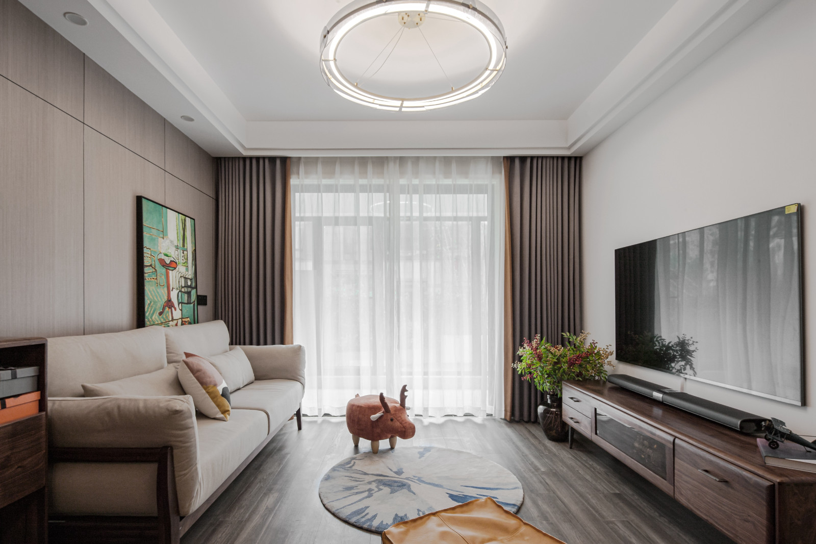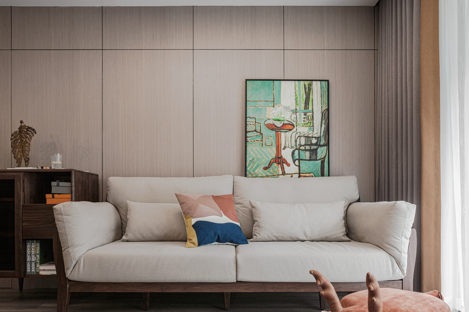 客廳戶型方正,整面木飾面板裝飾沙發背景墻,原木家具搭配米色布藝沙發,文藝淡雅。